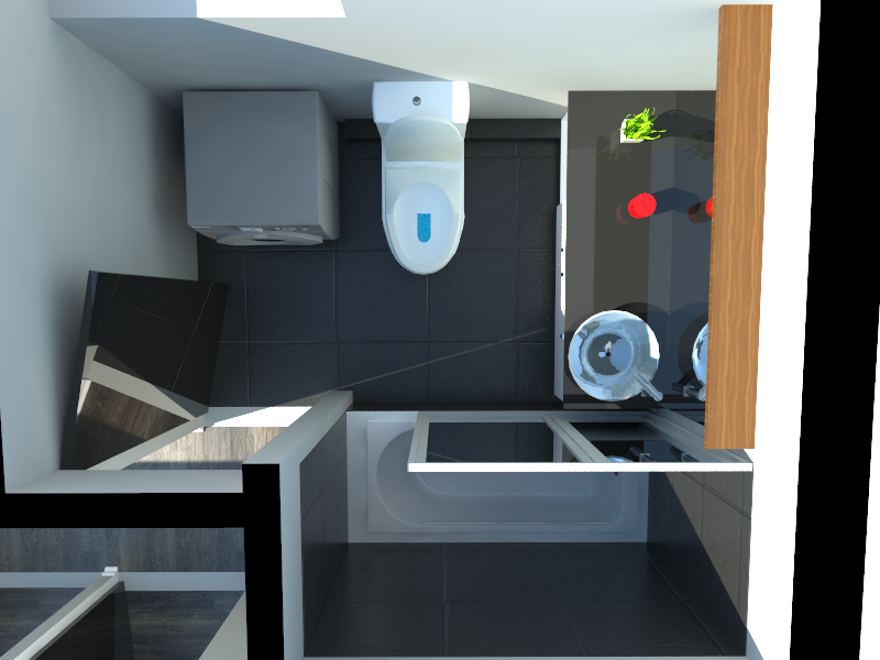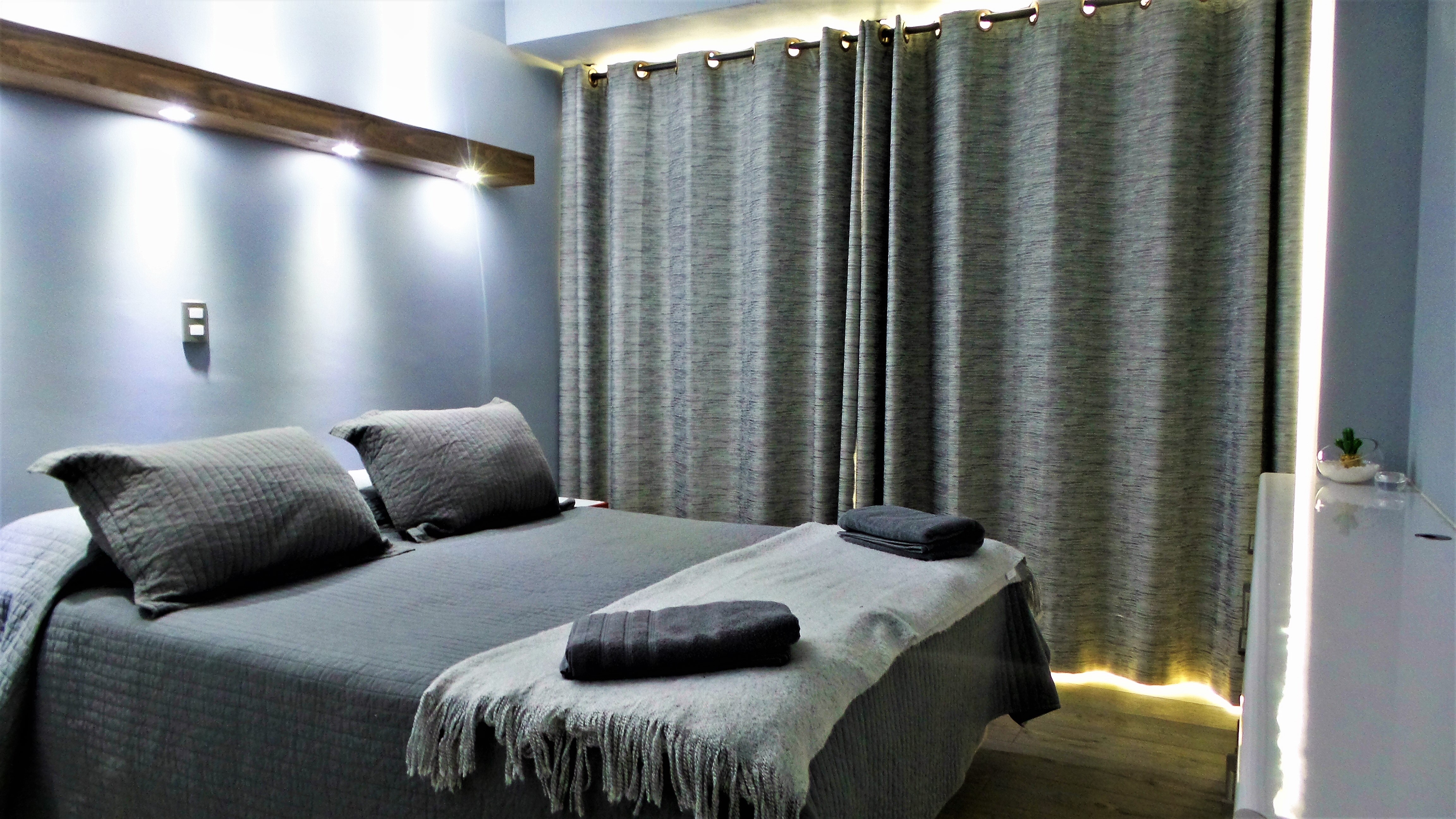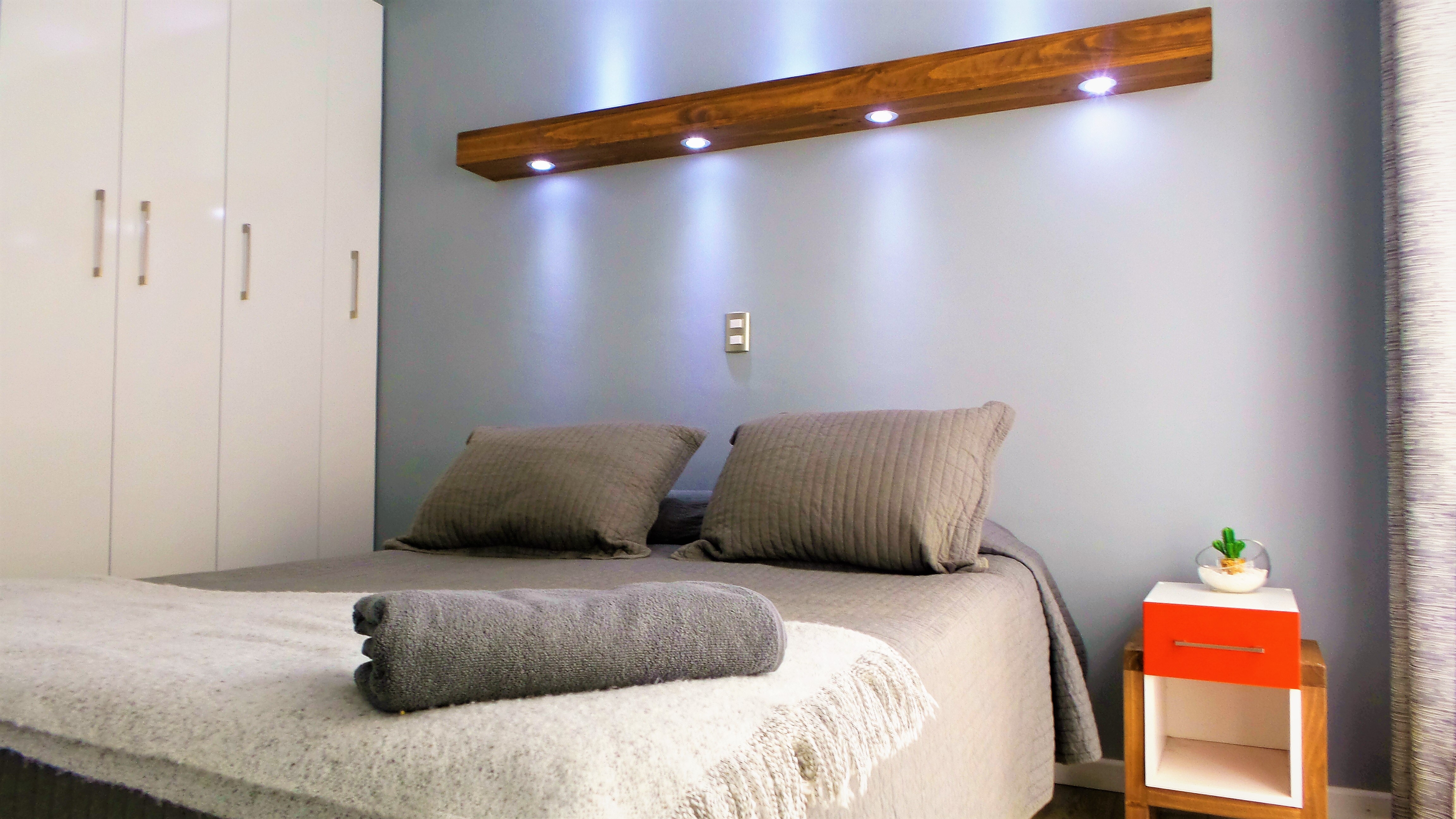En pavimentos se utilizó piso flotante de 8 mm. diseño madera envejecido color gris. Y porcelanato negro antideslizante para baño y cocina en piso. Se instalaron cubrejuntas metálicas color aluminio.