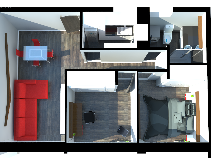 Blancos para cielos rasos, mobiliarios amplios y molduras. Grises para muros en esmaltes y cerámicos en cocina. Negros para cubiertas, cerámicos en baño y estructuras desnudas. Maderas envejecidas para pavimentos en lugares secos y cálidos, y luminarias. Y rojo, el cual se dispone en un detalle, el cual centra la atención: una tapa de un cajón, una cenefa, etc.