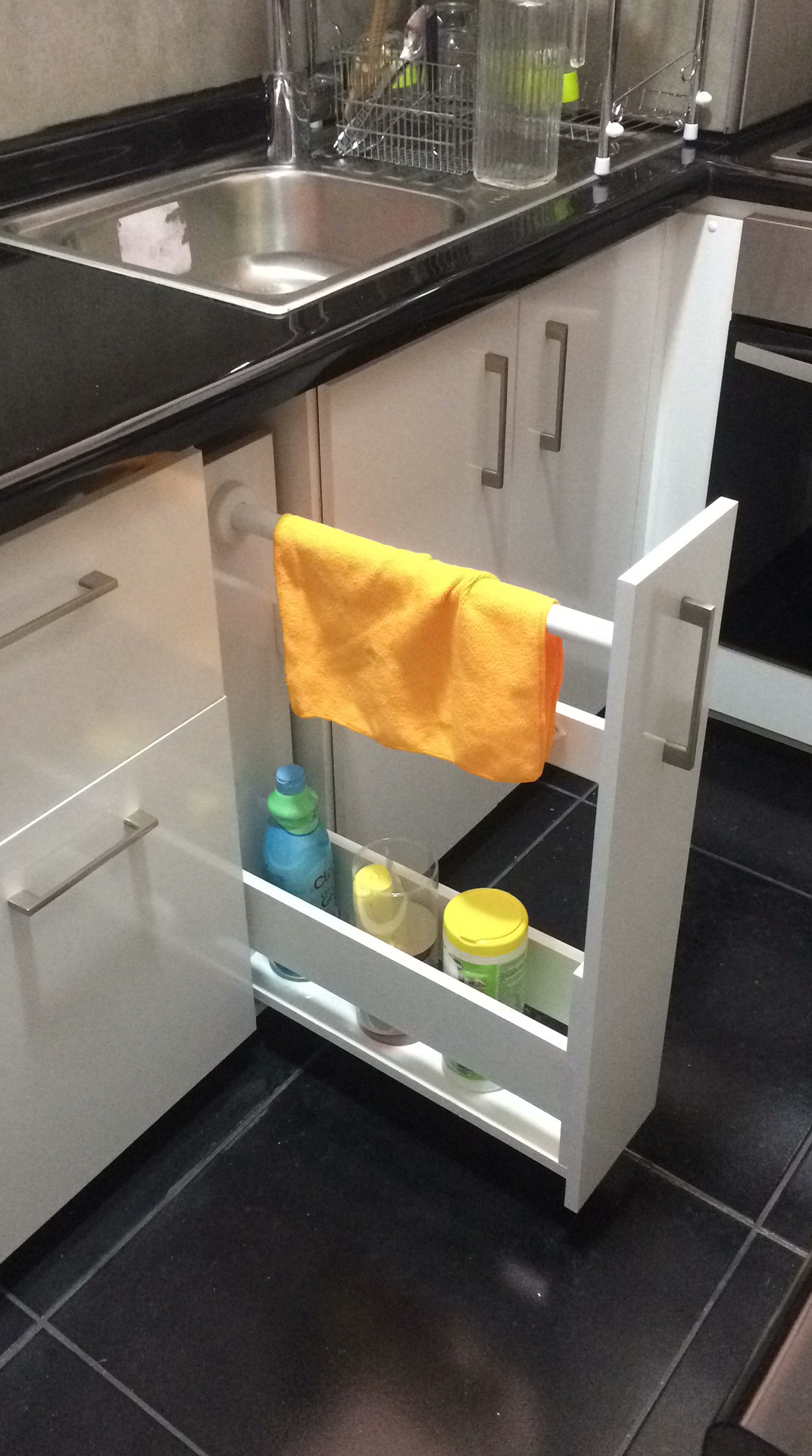 Quincallería niquelada en bisagras, bombines, correderas, pasaclables, topes de repisa y tiradores. Las fijaciones utilizadas corresponden a tornillos soberbios, puntas corrientes, tornillos screw y clavos tarugos. Se usó fieltro para base de mobiliarios.