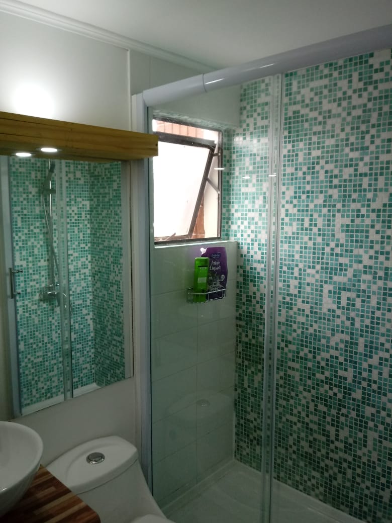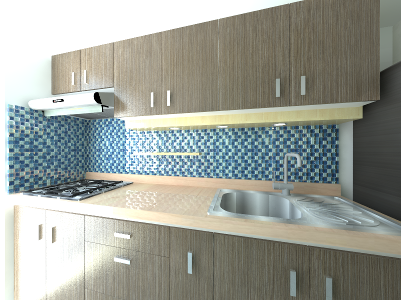 Para pared de cocina y baño, se utilizan mosaicos de vidrio coloreados con matices de celeste y verde, en el lenguaje del color protagonista del pantón. En son ornamento con un fin utilitario, se instalan las cenefas con luminarias adicionales en baño y cocina, en madera impermeabilizada.