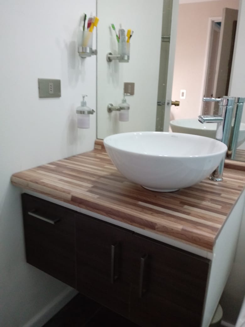 Para mobiliario en espacio común, se elaboran en placas aglomeradas de MDP de 15 y 18 mm, con revestimiento melamínico color almendra y gérnika (masisa). En el caso del mobiliario de cocina y baño, se utilizan placas de MDP en color blanco y gérnika. Postformado de MDF en 20 mm. y revestimiento de fórmica marmoleado fino rosa.