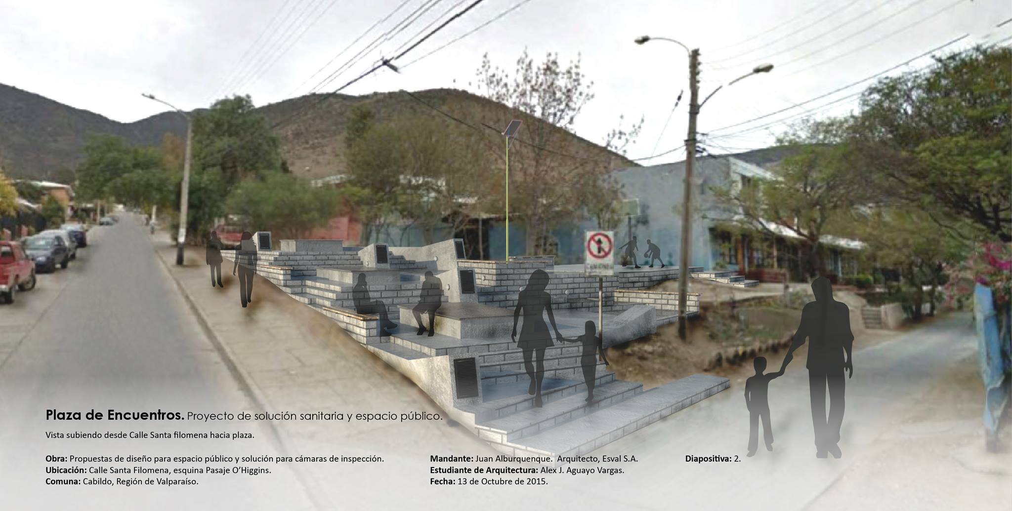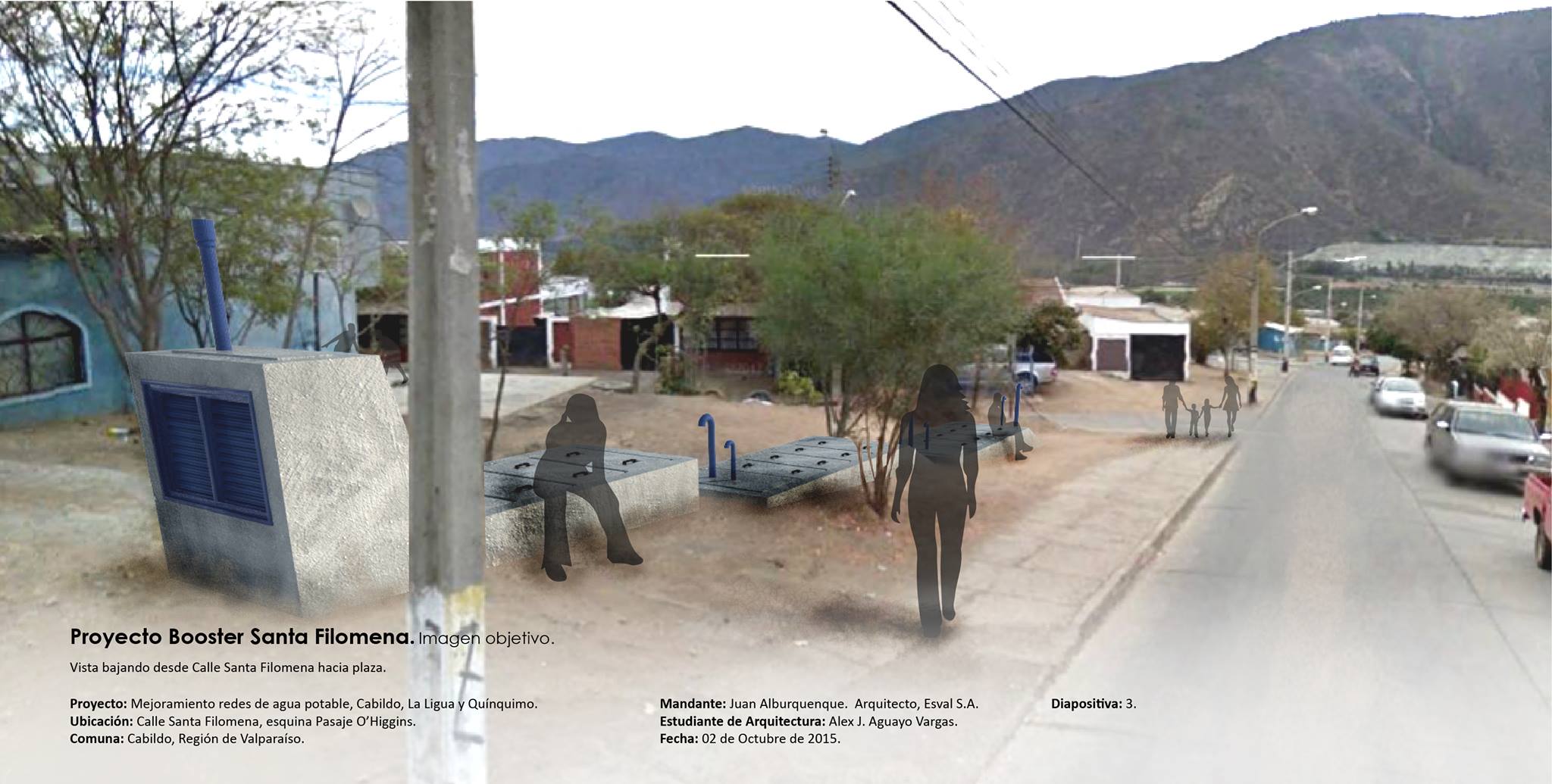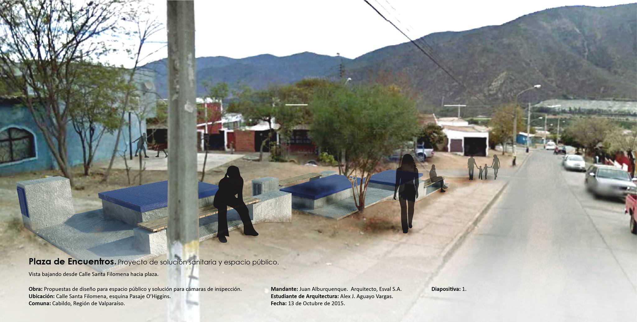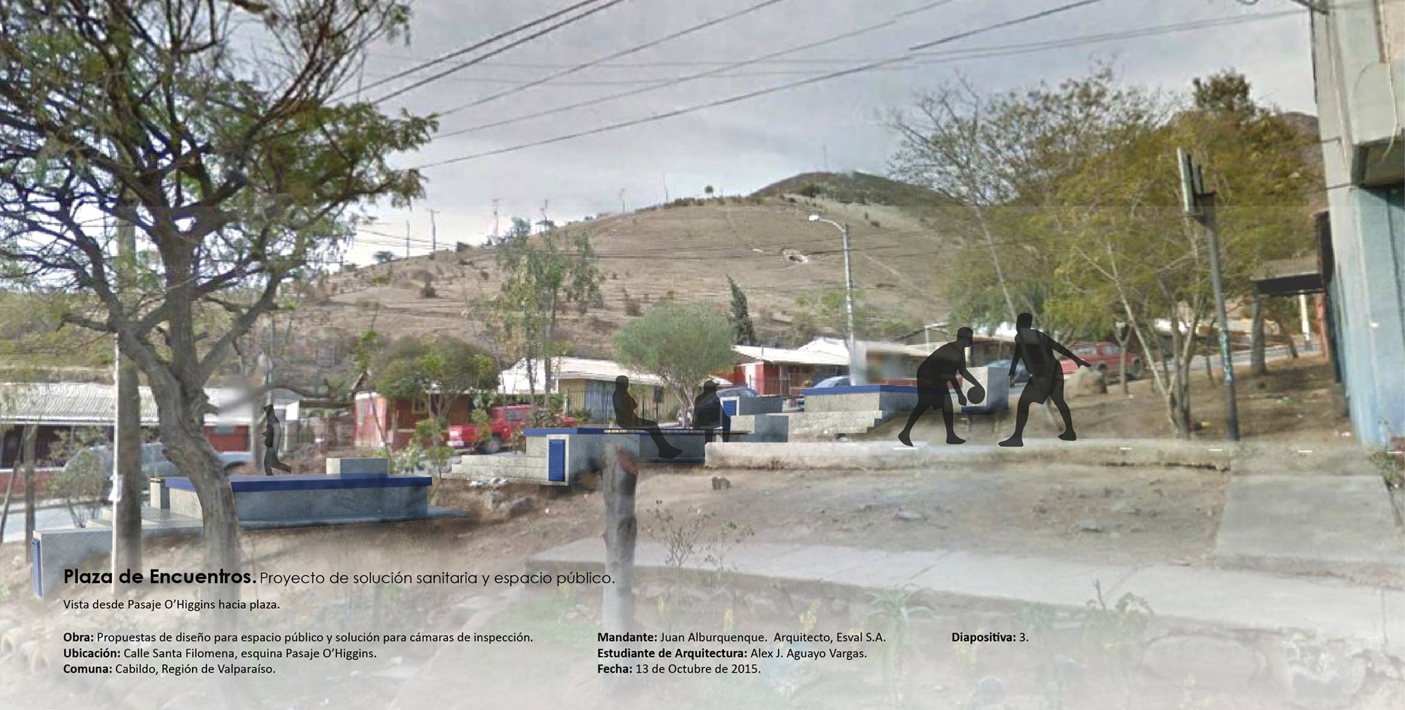 El Arquitecto Juan Alburquenque, a nombre del Departamento de Ingeniería de Esval S.A., nos solicita el partido inicial para el diseño de una Plaza Pública localizada en la Comuna de Cabildo, la cual contendría un sistema de bombas para aumentar presión de agua potable del sector.